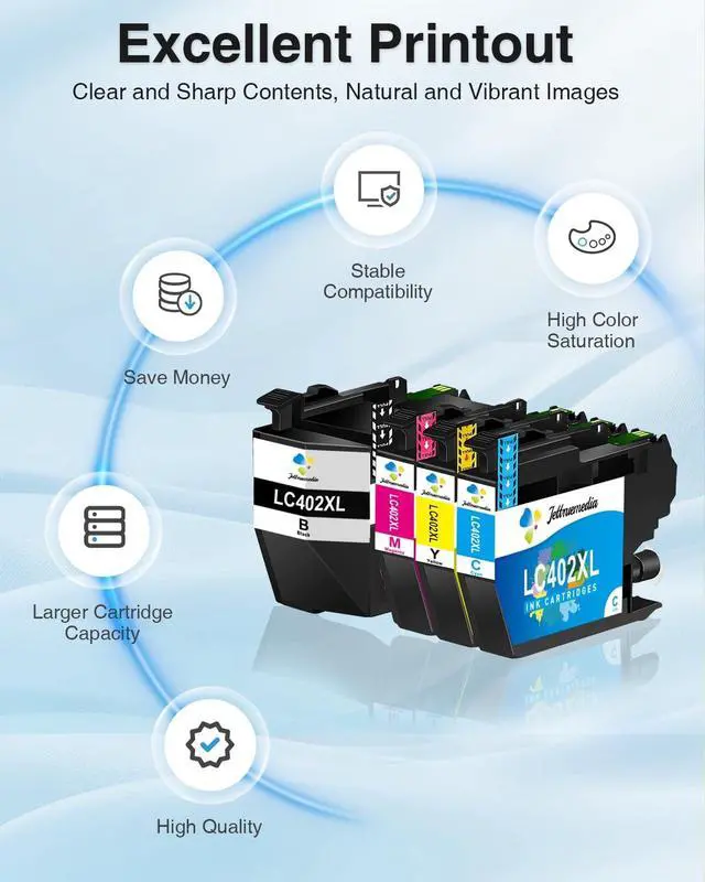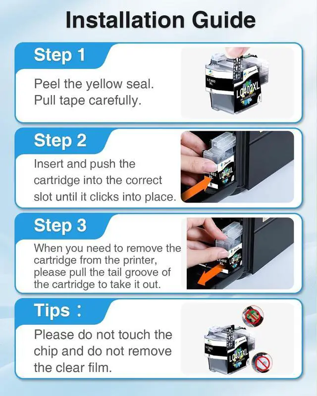 ^^ Excellent Print Quality: LC402XL ink cartridges compatible replacement for brother LC402 402XL ink cartridge contain upgraded chips. Built-in chip, easy to replace, easy office. Exclusive formulated ink ensure the vivid color vibrancy and long-lasting sharp prints. Improve print quality and save printing costs.