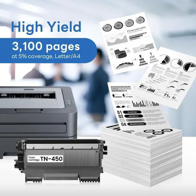 ^^ High yield: Up to 3, 100 pages per TN450 Black Toner Cartridge (at 5% coverage, Letter/A4).