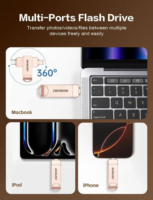 Plug and Play, Expand iPhone and iPad Storage Instantly, No App NeededRunning out of space on your iPhone or iPad? This 512GB photo stick offers immediate storage relief. Ideal for travel photographers editing on iPads, it eliminates storage worries across all your devices. Just plug it in, no complex setup required! ^^ 3 in 1 Multi-Port USB DriveOur versatile USB drive features separate USB-C, USB-L, and USB ports (Adapter), streamlining data transfer between devices. Say goodbye to cables, iTunes, and iCloud restrictions. Compatible with iPhone 16/15/14/13 series, iPad Air/Pro, Android smartphones (with OTG enabled), and computers.