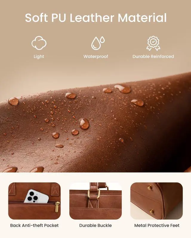 • Lightweight Upgraded Professional Work Bag This women's laptop bag is crafted from durable, high-quality water-resistant and scratch-resistant soft PU leather with a polyester lining. The reinforced flat bottom with four rivets minimizes friction and wear, ensuring the work tote bag lasts longer than other women's computer tote bags.