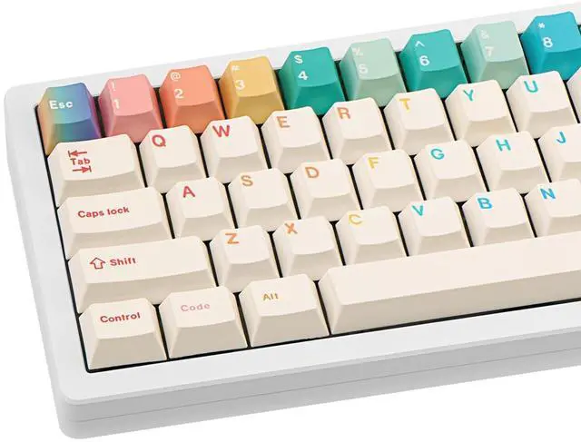 Thick PBT KeycapsMade from premium PBT plastic, these keycaps resist wear, fading, and shine over time. Unlike softer materials, PBT maintains crisp legends and vibrant colors, ensuring lasting performance and style. ^^ Cherry ProfileThe pbt keycap set designed with the classic Cherry profile, engineered for the ultimate typing experience. You won't get tired even if you use it for a long time at work or gaming. ^^ Macaron KeycapsThese minimalist macaron keycaps, featuring a milk like pure white color palette, the artistic depiction of beautiful rainbow, unique rainbow style delivers a charming appearance, which brings you a stunning feeling, it will be a good choice for the mechanical keyboard.