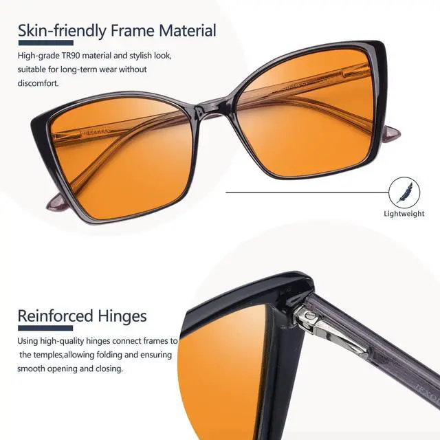 ^^ TR90 Material & Spring Hinges - The frame of TR90 material is not only unbreakable but also lightweight and flexible, making it comfortable and safe to wear for extended periods. The spring hinges ensure a perfect fit for all face shapes. ^^ Relief for Eye Strain and Fatigue - Engineered to combat eye strain, headaches, and fatigue from long hours on digital devices, these Orange-tinted glasses help your eyes focus and relax, reducing digital screen impact for more comfortable usage.
