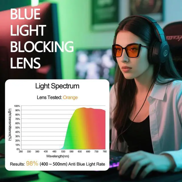 Orange Blue Light Blocking Glasses - Orange/Amber tinted lenses are made for sleeping & gaming, They filter out 98% of blue light, providing twice the protection compared to standard blue light lenses. This enhanced filtration helps alleviate headaches and migraines caused by prolonged screen exposure, ensuring a more comfortable and healthier viewing experience. ^^ Lens Technology - JFXQDR high-quality clear lenses feature OAR double-sided coating, OAR coating is an upgraded version of AR coating, They are scratch-resistant, anti-oil, waterproof, anti-fog, UV-protective, and anti-glare. ^^ Improving Sleep - Rigorous testing has confirmed that JFXQDR orange lenses block 98% of blue light in the "melatonin suppression zone" (400-500 nm), helping your body produce melatonin faster and promoting better sleep.
