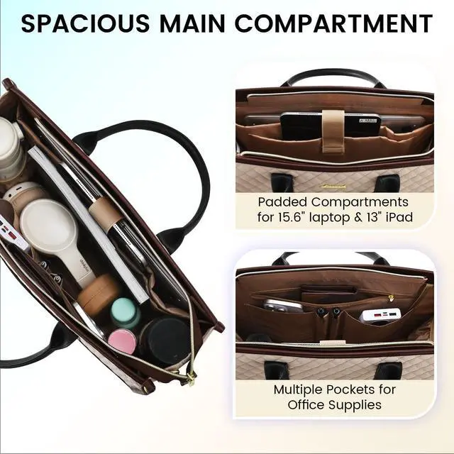 • Superior Storage & Smart Organization: This elegantly designed laptop bag for women (Size: 15.6" x 12" x 6") offers ample space for all essentials. Its compartments are tailor-made for A4 documents, folders, a 15.6" laptop, and a 13-inch tablet, each protected by sturdy padding. The laptop tote bag's smart internal layout, including a keychain holder and specialized pockets for water bottles and umbrellas, ensures that every item has its place.