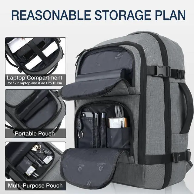 ^^ Well-Partitioned Storage: Two front pockets, side pockets and a 17-inch laptop pocket with foam padding, and a main compartment with mesh pockets and luggage compression straps to keep your travel gear organized and easier to find.