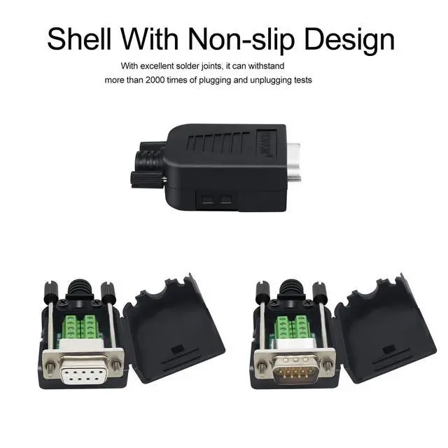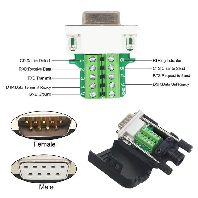 Its versatile 12-24AWG terminal wire range makes it suitable for various RS232 communication needs ^^ Reliable Signal TransmissionBuilt with copper contact materials and gold-plated pins, this DB9 connector provides excellent conductivity and corrosion resistance. It ensures stable signals across different devices, reducing data loss and improving connection stability ^^ Complete Package for Easy InstallationEach set includes a DB9 Male Adapter, protective covers, and a sturdy case for storage. Its design with clearly labeled signal ports simplifies wiring, making it an ideal choice for professionals needing a durable DB9 breakout connector