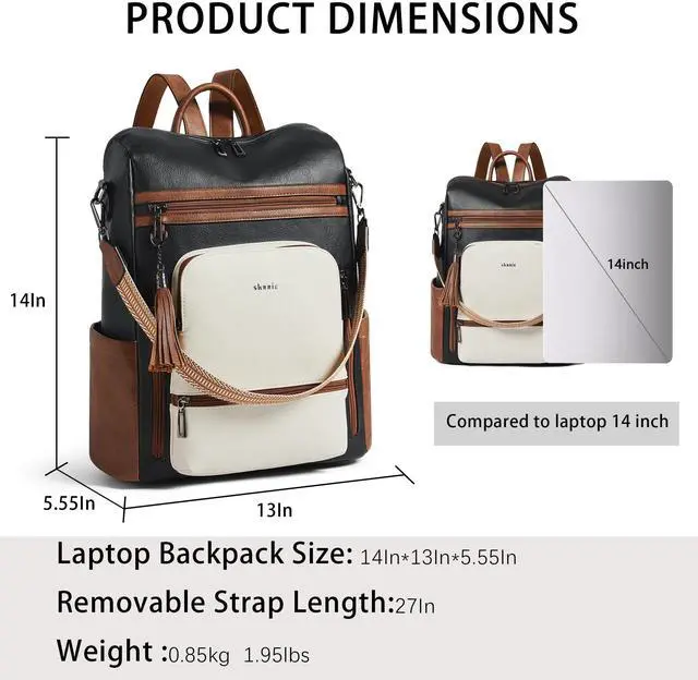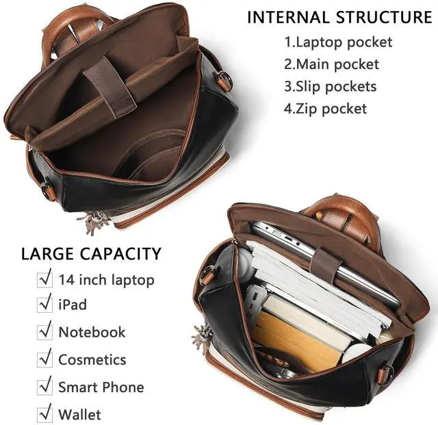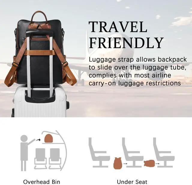 Leather Laptop Backpack for WomenMade of high quality waterproof Vegan leather, HEAVY DUTY & DURABLE. Total of 9 pockets, easy to organize all work necessities, college supplies, travel essentials. ^^ Practical Backpack Luggage Strap DesignDesigned for traveling, it helps you free your hands and back from the burden. Make your travel more convenient and enjoyable. Waterproof travel backpack fits under the seat also meets airline carry-on requirements. ^^ Large CapacityThe large capacity laptop backpack has multiple divider pockets, easy for holding laptop, ipads, Phone, binder, water bottle, umbrella, magazine, pens, wallet and so on.