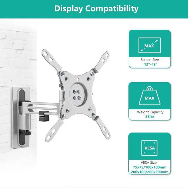 Compatibility: Full motion heavy duty wall mount or RV wall mount for most 13 to 43 inch flat panel displays up to 33lbs, with mounting holes 75x75mm to 200x200mm.