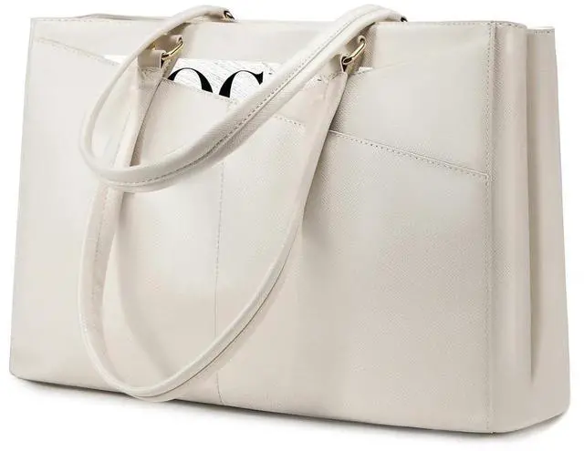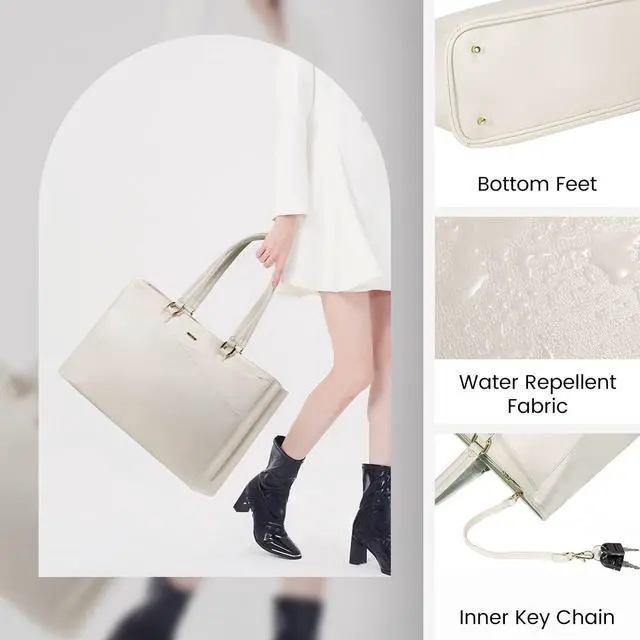 Material Laptop Bag: This computer tote is crafted in durable, water-resistant, scratch-resistant PU Leather and polyester lining. Top smooth metal zipper for easy opening. Metal feet base protects your bag from damage. ^^ Dimension & Chic Practical Tote Bag: Dimension of tote bag is 16.5" L * 5.5" W * 12" H;