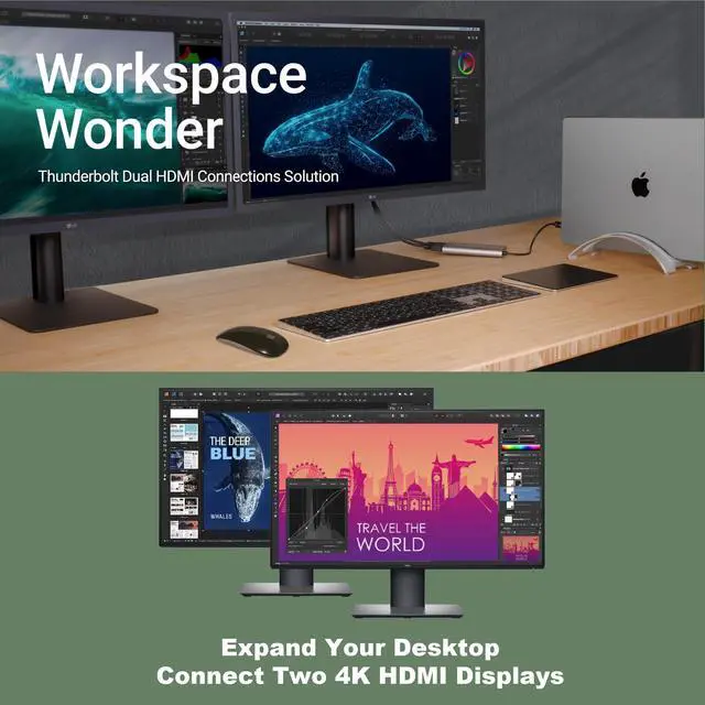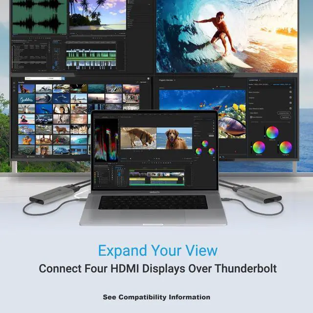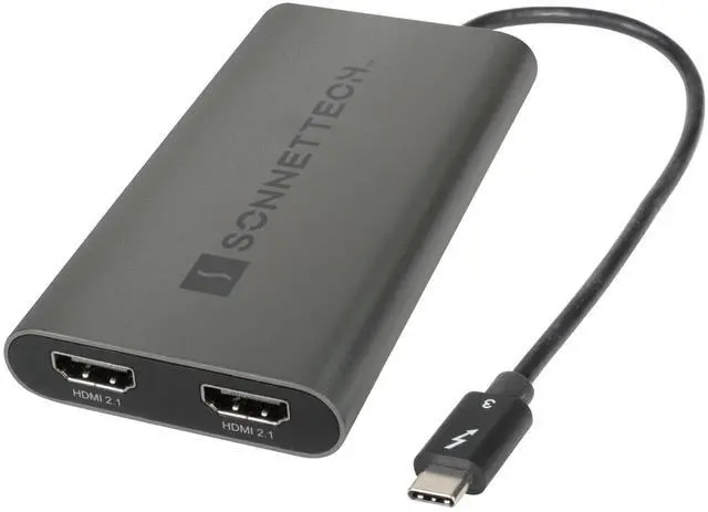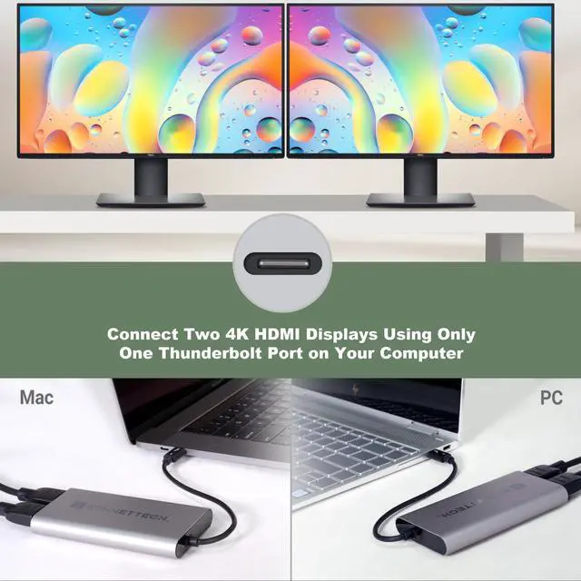 Thunderbolt Port: Enables connection of two 4K @ 60Hz (Mac) or up to 4K @ 120Hz (Windows) HDMI displays to a single Thunderbolt port on your computer. ^^ 8K @ 60Hz and Dual 4K @ 120Hz