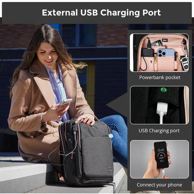ALL DAY COMFORT: Adjustable padded straps provide the right women's computer backpack fit to give you comfort all day. The added USB Charging Port provides quick access to charge and use your phone and other USB devices while walking (A powerbank is not included. A special powerbank is not required. Built-In Water Bottle holder provides you with easy storage to stay hydrated throughout your day ^^