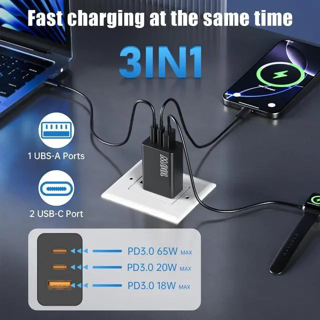 ^^ Safe and Reliable GaN TechnologyApplied the latest GaN Technology, which maximizes its charging efficiency with less heat dissipation, charge protection, as well as making charging much safer & more convenient. Our Block USB C wall charger block is small and portable, which can be easily put into your pocket or bag, will not take up too much space, perfect for all kinds of office, home use, also great for portable outings and traveling. ^^ Package Included2*100W 3 Ports USB C Wall Charger (cable not included), 12-month replacement & 24*7 friendly customer support, if there is any quality problem, please contact us.