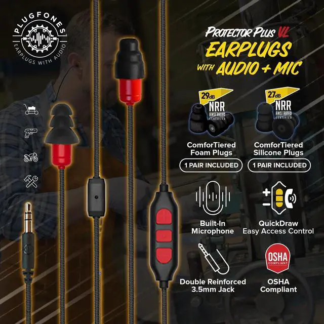 NOISE REDUCING EARBUDS & MIC: Weve combined comfortable, OSHA compliant earplugs & tuned speakers to make OSHA hearing protection with rich, clear sound & a Noise Reduction Rating ( NRR ) of 29 db.