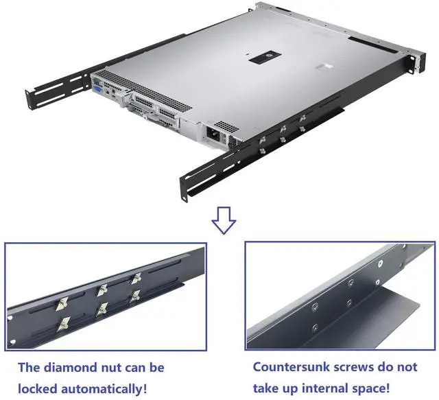 Product Size: H 1.75" x W 2.83" x D 16"-33", Fits any rack and cabinet including 19", 23", 30". ^^ Depth Adjustable from 16 Inch to 33 Inch, you can accommodate various rack sizes. ^^ Made of high quality cold rolled steel with powder coating, Support up to 110 lbs when 4 post rack or cabinet at 16 Inch Deep. ^^ Including 1 Pair of 1U Server Shelf Rails, 8 sets of M6 screws and cage nuts. ^^ Designed to support most servers in a rack or cabinet.