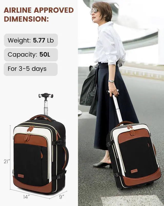 Multi-Compartment Design: This travel rolling backpack measures 21 x 14 x 9, offering a generous 50L of storage space. With multiple compartments and dry-wet separation, its perfect for your 3-5 day trips! ^^