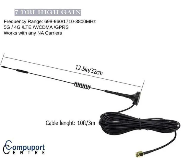 Frequency Range 698-960/1710-3800MHz ^^ CompouPort CPC-Q7027I28 magnetic ultra-wide band cellular antenna delivers stable high omni-directional gain and across all 2G (GSM), 3G and 4G (LTE) 5G, cellular bands from 698 MHz to 3.8 GHz. ^^ This high performing antenna can be used for all cellular devices and will not require changing antennas when deploying from country to country or technology to technology like CDMA to GSM or 3G to 5G. ^^ CompuPort Mobile Antenna being magnetic mount it is designed to be mounted on a ground plane for optimal performance.