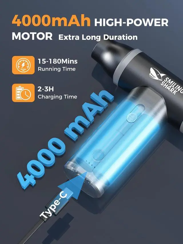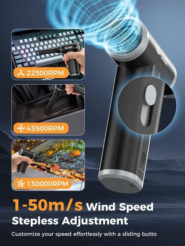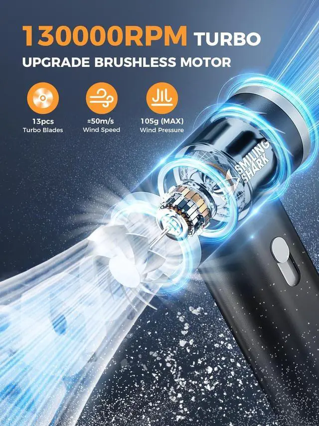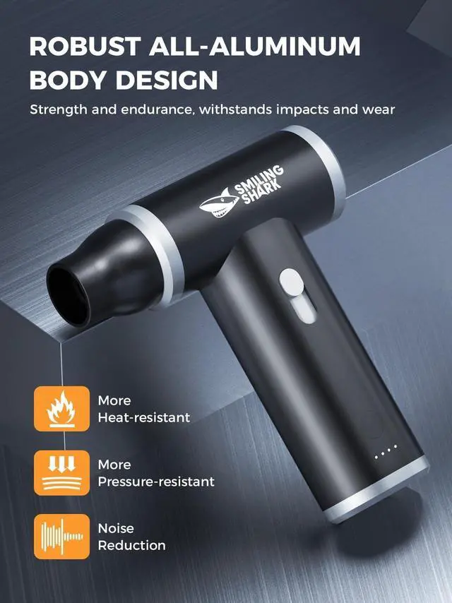 & --Smiling Shark J-01 Electric Air Duster adopts -, the wind power can reach /, while the air pressure up to, and the dust removal capacity is.. Effortlessly and quickly blow away all dust to meet all your daily cleaning needs. Combined with high-speed brushless motors, can significantly increase the air output. ^^ - Say goodbye to level switch modes and fixed wind speeds. With the J-01 Electric Air Duster, simply from ~ (: /), giving you complete control over both wind power and range. Slide the speed control button to adjust wind speed for cleaning different equipment. ^^ J-01 Reusable Air Duster is, with effective waterproof and corrosion resistance. Compared to plastic/ABS materials, aluminum alloy has better heat conduction, which can dissipate heat better when working at high speeds and will not cause shutdown due to overheating. The simple design, combined with aerospace-grade aluminum alloy, offers a delicate appearance and feel that will keep you engaged even without turning it on. ^^ & Equipped with detachable replaceable nozzles,, J-01 Air Duster ensures safer use and makes the dust removal efficiency doubled. Considering the size and weight, J-01 Mini Air Duster chooses a. Although it is not the largest capacity battery on the market, J-01 Air Duster guarantees that it can be used continuously for more than 15mins under the max speed of 130000RPM and up to. ^^? Why do we choose brushless motors?...,. Smiling Shark J-01 Dust Blower c,. We only present the best to you.