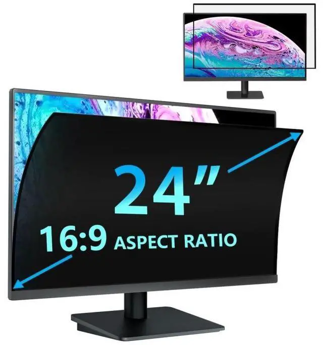 Note: Raised frame monitors NOT fit. ^^ Upgraded Installation & No MessThe Stary 24" monitor privacy screen is fully upgraded, eliminating the need for plastic tabs or tape to hold the privacy screen in place. Say goodbye to screens that leave a sticky residue when removed and stop working after a few uses. Our filter will automatically attach to the inactive black area of the display edge smoothly, quickly, and seamlessly. It can stay firmly on the screen and supports take down/on as needed, leaving no sticky residue. ^^ Superior Privacy and Anti-GlareOur advanced multi-layered film filter blacks out your computer screen when viewed from the side while maintaining a crystal clear screen straight-on. It also protects your eyes from harmful glare, UV, and blue light.