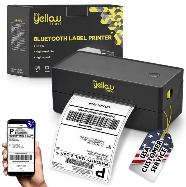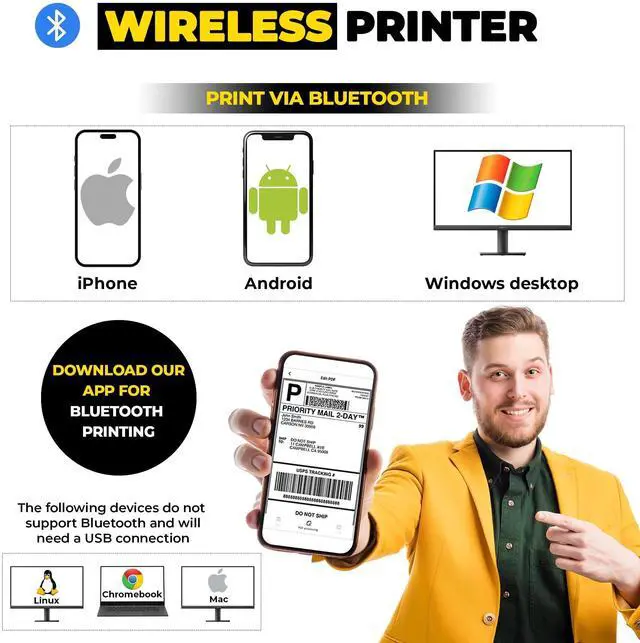 Wireless printing - Our thermal printer easily prints from any phone or windows computer via bluetooth connection ^^ High Speed - Our thermal label printer prints 70+ labels per minute - Easily connects via bluetooth ^^ Super Clear - Labels come out clear and visible for easy reading and scanning because of our high resolution 203 DPI print head ^^ Smart & Simple - Automatic positioning, paper return, & self-test - user-friendly design with simple controls makes it easy for anyone to use ^^ Compact & Durable - Label printer weighs only 2.3LB making it super easy to carry and setup in home, office or warehouse ^^ Versatile Compatibility - Our thermal shipping label printer is compatible with all major shipping platforms (see list of all platform by photos) ^^ Our friendly U.