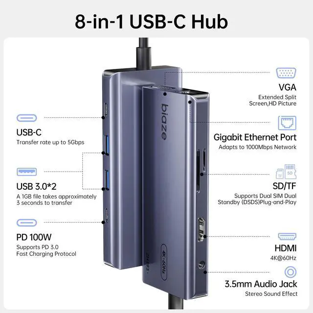 4K@60Hz Dual Monitor HDMI & VGA Adapter Experience ultra-clear 4K@60Hz video output through the HDMI and VGA ports, supporting mirror or extended Dual Monitor modes. This USB C Hub delivers vivid details and true-to-life colors with synchronized audio, perfect for business presentations or home entertainment on your MacBook Pro or Dell laptop. ^^ High-Speed Data Hub with SD/TF Card Reader Equip your setup with a high-speed USB 3.0 port (transfers a 1GB file in seconds) and dual SD/TF Card Reader slots supporting SD 3.0 protocol. This Multiport Adapter provides a blazing-fast solution for photographers and professionals, solving the card slot problem on modern ultra-thin laptops.