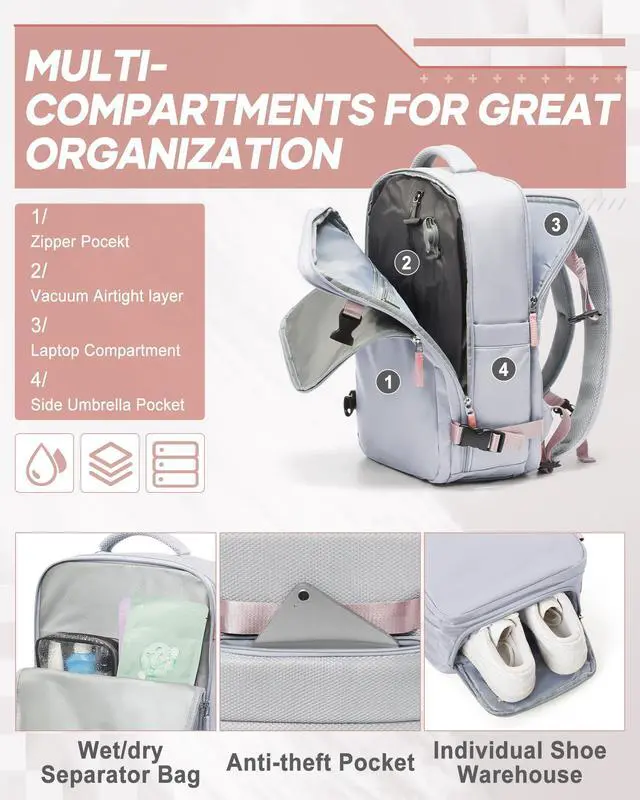 Organized: In addition to the large capacity main compartment of the vacuum backpack travel, this vacuum compression backpack is also equipped with independent shoe compartment/independent laptop compartment/independent dry and wet pockets, as well as multiple functional pockets that can hold a pair of shoes, a 15.6 inch laptop, toiletries, cosmetics, and other personal items, and separate wet and dry items to keep your equipment organized.