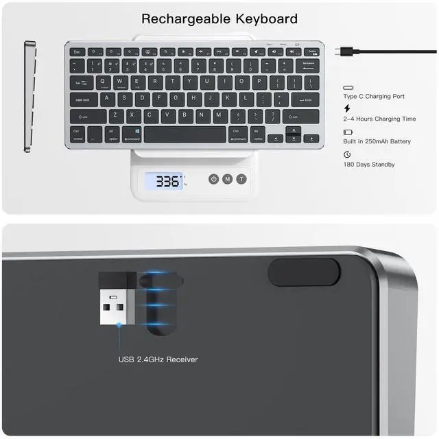 Rechargeable: Equipped with a built-in 250mAh rechargeable battery, this bluetooth keyboard can be fully charged within 2-4 hours, 180 days of standby time, type C charging port ^^