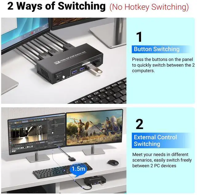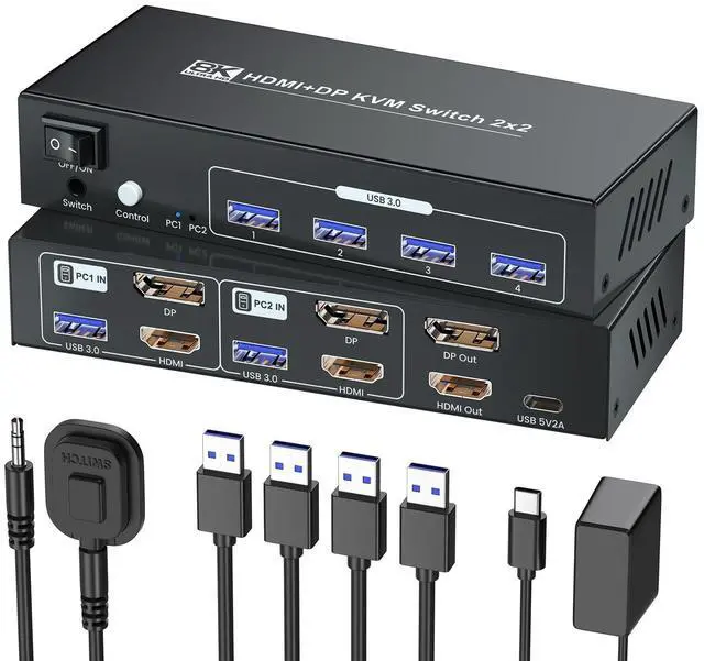 8K HDMI & DisplayPort KVM Switch 2 Monitors 2 ComputersTake Control of Your Multi - Computer Setup with This 8K Dual Monitor KVM SwitchAre you tired of juggling multiple keyboards, mice, and monitors just to switch between 2 computers? Our 8K HDMI & DisplayPort 2 port KVM Switch is here to revolutionize your workspace. This dual port KVM switch lets you connect two computers to two monitors with a single keyboard and mouse setup. Whether youre a professional working on complex projects or a gamer looking for an immersive experience, the KVM switcher is your ultimate solution.