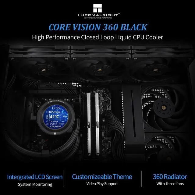 STABLY-FDB bearings (abbreviation: S-FDB bearings), which can solve the problem of fan blade shaking and vibration in the lifting mode, and the fan's dispensing dynamic balancing 2.0 process not only ensures the longevity of the CPU water cooling cooler, but also greatly improves the performance of the cooling fan. ^^ [ 2.1 inch display] The heat dissipation LCD supports personalised moving picture display, 450 NITS peak brightness, 24 BIT true colour, ARGB ring light on the side of the cold head, free monitoring of the display of various system parameters, background format as well as customised text can be displayed, superb display play. ^^ [Wide compatibility]Water-cooling radiator supports Intel 14th generation + AMD RYZEN 7000, Supported