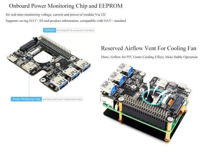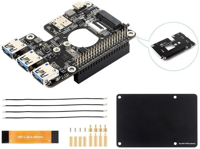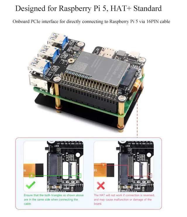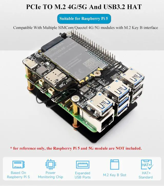Raspberry Pi 5: HAT+ standard design with onboard I2C. Onboard PCIe interface for directly connecting to Raspberry Pi 5 via 16PIN cable ^^ More USB Capability For Raspberry Pi 5: Extends The PCIe Interface To 3x High Speed USB 3.2 Gen1 Ports For Connecting More Peripherals ^^ Compatible With Multiple 4G/5G modules with M.