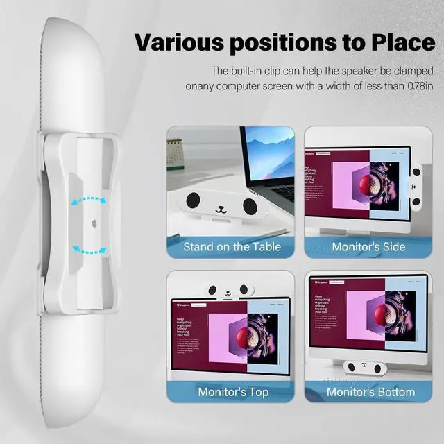 The single USB design avoids the hassle of cable management, allowing you to keep your desktop tidy while using as little space as possible on your desk ^^ Easy Clip to MonitorTo maximize your desktop space, we designed a spring-loaded clip on the bottom of the speaker that opens manually and merges automatically, making it easy to clip the speaker to the top, sides and bottom of your monitor. Of course, you can also leave the speaker standing smoothly on a desktop. The maximum size of the clip opening is 0.78 inches, which makes it easy to clip the speaker to most monitors on the market! ^^ Multi-Functional ButtonsThere are 3 buttons on the top of external speakers for laptop, which are volume up, volume down and mute button.