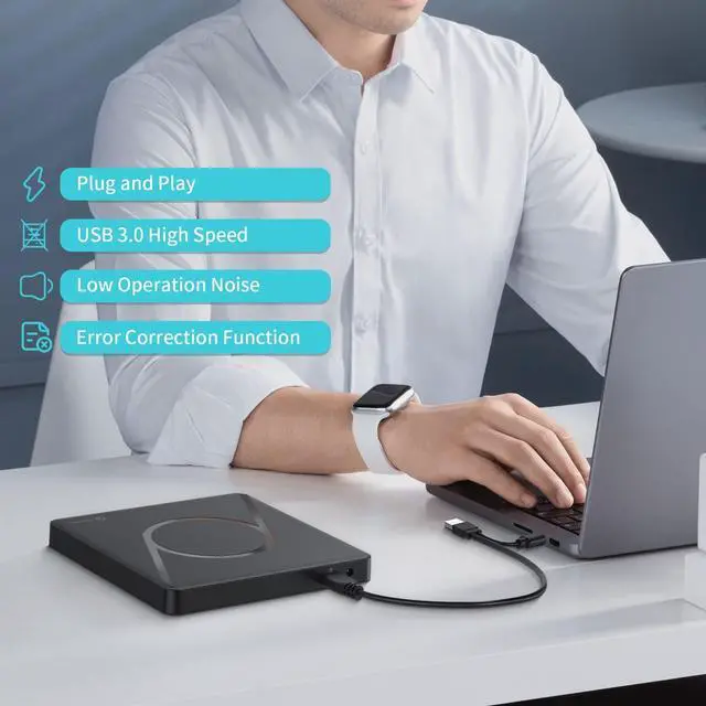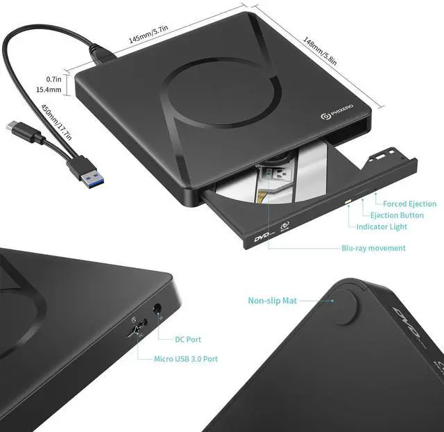 Plug and Play & Easy to UsePHIXERO external blue ray dvd burner is easy to use, no need to install any program driver, just plug external blu ray DVD drive into the USB port to be able to detect the DVD driver, the operation is simple, only You need to drag the file to the burn icon to start burning. ^^ External Blu Ray DVD Drive USB 3.0PHIXERO usb blu ray burner adopts high-quality recording technology, supports 6X BD-ROM, 8X DVD-R, 8X DVD+R, 6X DVD-RW, 6X DVD+RW, 16X CD-RW, 24X CD-ROM, using USB 3.0 output interface, backward compatible with USB 2.0, bringing stable data transfer speed up to 5G, playing music and movies without delay or distortion.
