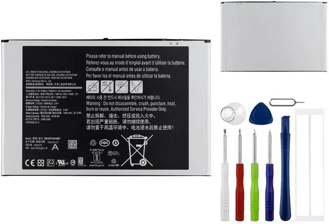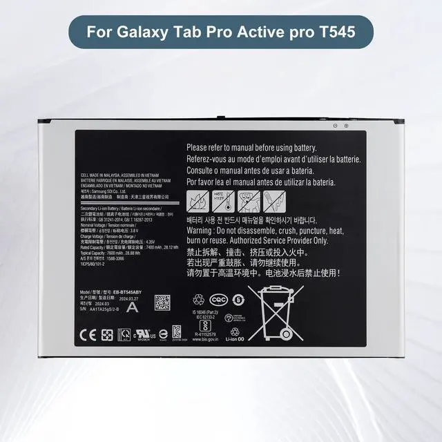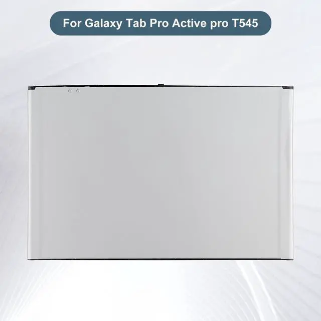 PolymerPackaging: 1 x battery1x toolsCompatible withSamsung Galaxy Tab Pro Active pro T545 SM-T545Notice before purchase1. Be carefully check the model number of your device to see if this battery is compatible with your device. 2. A new Li-ion battery will achieve its best performance after 2 or 3 complete cycles of charge & discharge. 3. When you install it, be sure the connector has been properly connected to your device. 4. Do not use low quality third-party adapter charger to charge your device, that will shorten the battery's life. Contact usIf you have any questions or any issues when using our product, please send us a message, we will answer you within 24 hrs. Thank you for your time.