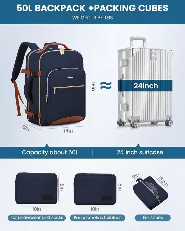 LOVEVOOK Travel Backpack for Women & Men 50L,Airline Approved Carry On Backpack Travel Essentials,TSA Carry on Luggage,Waterproof Personal Item Travel Bag,Suitcase with 3 Packing Cubes,Dark blue-Brown
