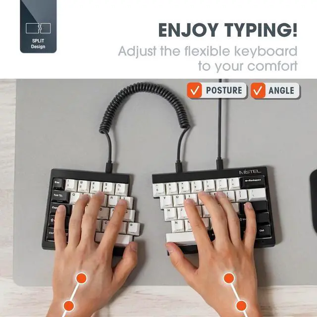 Ergonomic Excellence Engineered with ergonomic considerations, our split keyboard ensures a more comfortable typing experience, minimizing wrist discomfort even during prolonged usage sessions. ^^ Compact and Portable Design Featuring a sleek and compact design, our keyboard is highly portable, allowing you to carry the left side separately for on-the-go usage convenience. ^^ Effortless Customization with Marco Functions Benefit from the comprehensive Marco functions integrated throughout the entire keyboard, enabling you to define your keys effortlessly for a personalized typing experience. ^^ Premium PBT Keycaps Our keyboard is equipped with PBT keycaps, featuring laser-carved legends on the front and side, ensuring clarity and ease of understanding for all operating functions.
