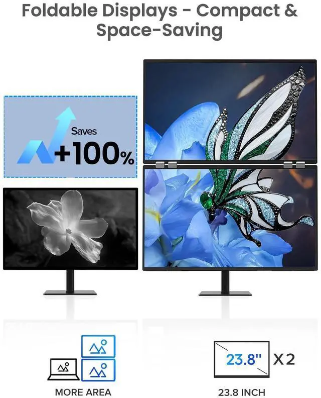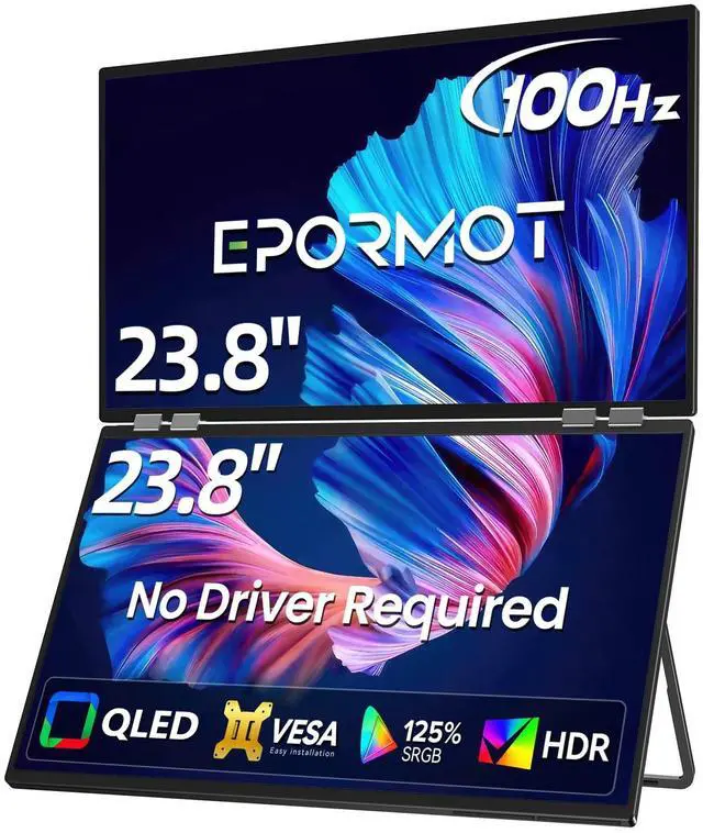 Foldable Design: EPORMOT 23.8 dual screen is built with a 180 foldable metal stand. And it can be folded when you are not using it, saving space while keeping the display in good condition for long-term use ^^ Plug-and-Play, Universal