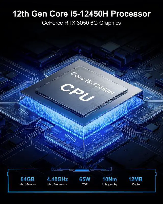 12th Gen i5-12450H Mini Gaming PCThis mini PC is equipped with the 12th generation Core i5-12450H processor, 8 cores, 12 threads, 12MB cache, up to 4.4GH z. It runs faster and more efficiently than the i5-12400T and i5-12500T processors, providing excellent multi-threaded performance for gaming, content creation, and video editing. Compared with other mini PCs, Baieyu small gaming PC is the first choice for professional gamers and 3D renderers. ^^ High-Performance RTX 3050 Series GPUBaieyu mini gaming computer is equipped with Nvidia Geforce RTX 3050 6G GDDR6 graphics card.