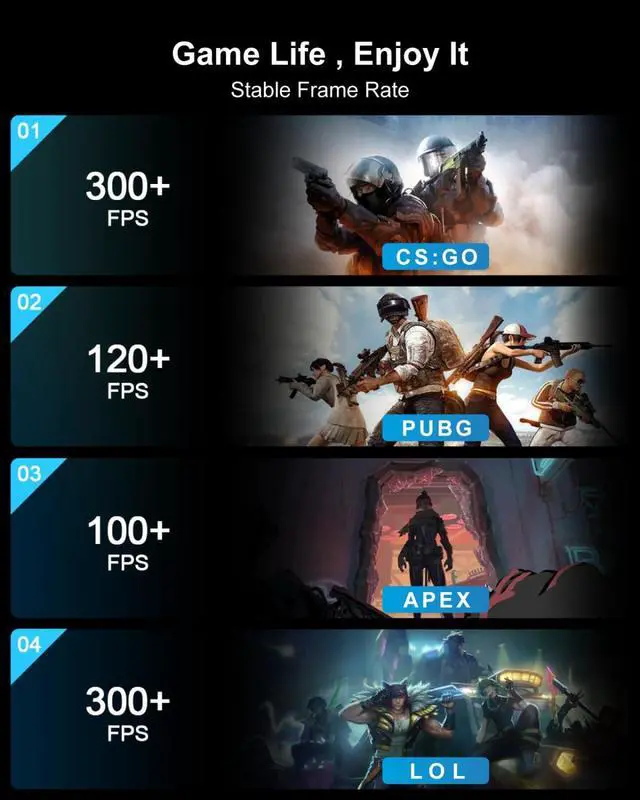 CS: GO, DOTA2, APEX, PUBG, GOW etc. Whether you are rendering complex 3D scenes, processing up to 8K videos, or live streaming, the GT mini gaming PC can meet your creative needs. ^^ 32GB DDR4 + 1TB M. 2 NVMe SSDBaieyu GT mini gaming computers built-in dual-channel 32GB DDR4 3200MHz RAM (up to 64GB), 1TB NVMe PCIe 4.0 SSD (PCIe 4.0 SSD is 4 times faster than SATA SSD), expandable up to 4TB. PCIe 4.0 SSD reading speed can reach up to 7000MB/s, providing lower latency and higher bandwidth. The microcomputer also supports 1xSATA 3.0 for installing a 2.5 -inch SSD/HDD slot (not included), expandable up to 6TB for massive storage space. ^^ Quad Display & WiFi 6E & BT 5.2T his mini gaming PC supports quad display, dual HD 2.0 (4K @60Hz) + dual DP 1.4 (8K @6HZ), allowing you to multitask, play games and enjoy clearer and more realistic visuals. WiFi 6E supports a 6GHz band, and BT 5.2 transmission rate can reach up to 2 Mbps, whether it is online gaming or large file transfer, you can enjoy lightning-fast network speed.