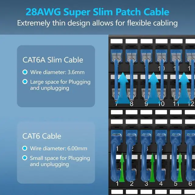 Maximized Space Efficiency: CableGeeker CAT6A patch cables are approximately half the diameter of traditional patch cables. This means you can fit three of our cables in the same space as a standard one, enabling you to route multiple connections in tight spaces with ease. Perfect for high-density environments like data centers and telecommunications rooms. ^^ Exceptional Flexibility for