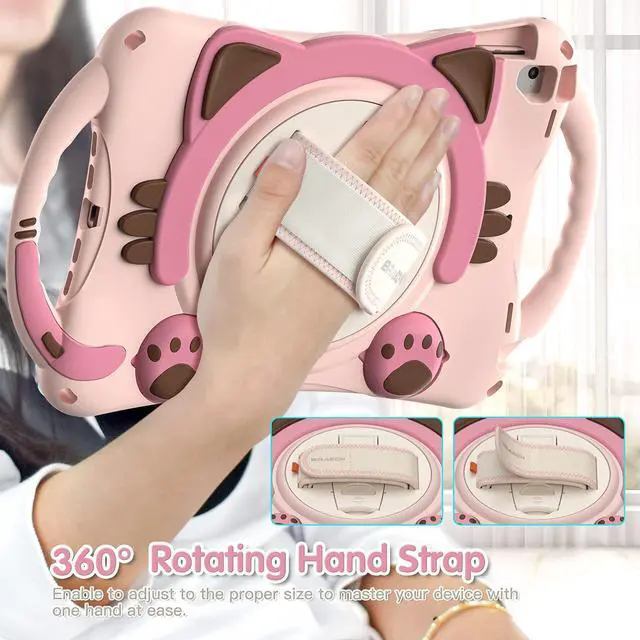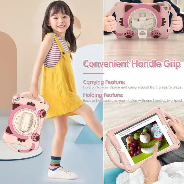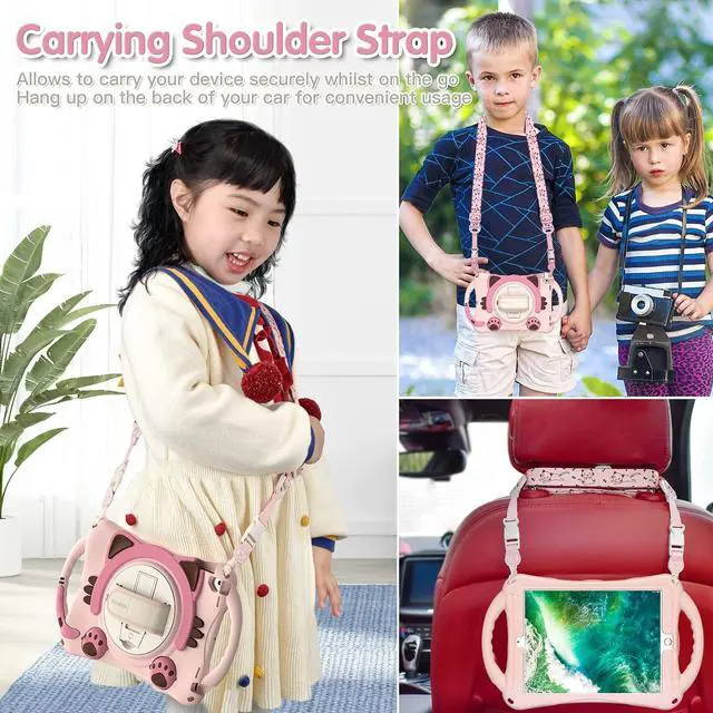 ^^ Adjustable shoulder strapsAdjustable Carrying Shoulder Strap allows you to carry your iPad 9.7 with hand free; Built-in Pencil Holder will store your iPad Pencil securely with our case on. APPLE PENCIL IS NOT INCLUDED. ^^ Multi-functionBuilt-in 360 degree rotating kickstand and adjustable hand strap provide a more flexible and convenient way to use your iPad 9.7 Inch, ideal for boys, girls, children. ^^ Function MethodConvenient Handle Grip enable to hold on and carry your iPad 6th/5th from place to place whilst offer a easier way to hold and use your iPad Air 1/2 with one hand or two hands.