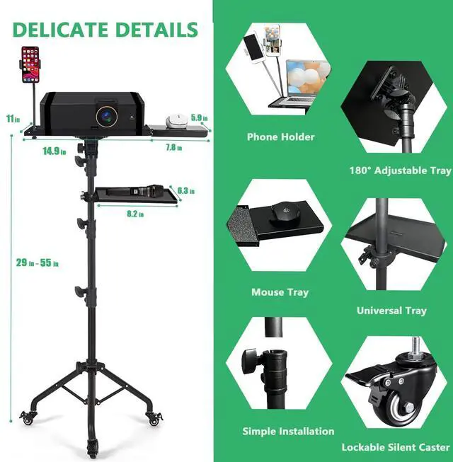 Please Note: The casters are detachable and can be taken off when not needed. Foldable and Easy to AssembleThe Laptop Tripod easy to install and disassemble, 360rotatable, convenient to carry and store. ^^ Excellent Stability and Durability1. This projector tripod stand with wheels is made of sturdy high quality metal, max load of the laptop tripod is 25 pounds. 2. The bottom of the projector tripod uses a reinforced steel tripod construction, which prevents shaking, provides excellent stability and supports your device perfectly. 3. The surface of the metal is coated with a thin coating that prevents rust and scratches, which offers excellent durability. ^^ Adjustable Height/180Rotating Tray1. The height of the Laptop Tripod Stand with free setting available, can be easily adjusted from 27 to 53 inch. 2.