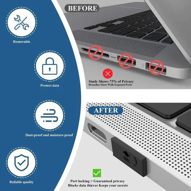 ^^ Two-Way Protection: Our premium USB-A port blocker provides dual-layer protection. It physically blocks USB ports to prevent unauthorized access and safeguard your data integrity, while also shielding your device from dust to extend its lifespan.