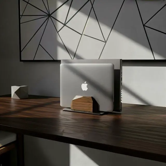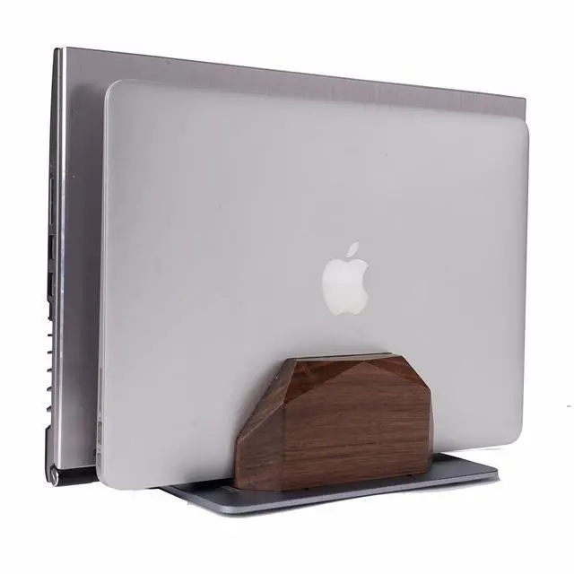 Classic: Crafted from gunmetal gray aluminum and solid black walnut, this wood laptop stand combines functionality with aesthetic appeal, fitting seamlessly into any office or home docking accessories setup.