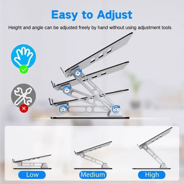Adjustable & ErgonomicThis laptop stand can be adjusted to a comfortable height and angle according to your actual needs, letting you fix posture and reduce your neck fatigue, back pain and eye strain. Very comfortable for working in home, office and outdoor. ^^ Sturdy & Protective Made of sturdy metal, it can support up to 17.6 lbs (8kg) weight on top; With 2 rubber mats on the hook and anti-skid silicone pads on top & bottom, it can secure your laptop in place and maximum protect your device from scratches and sliding.
