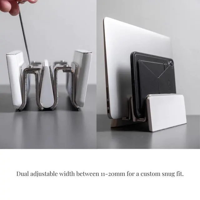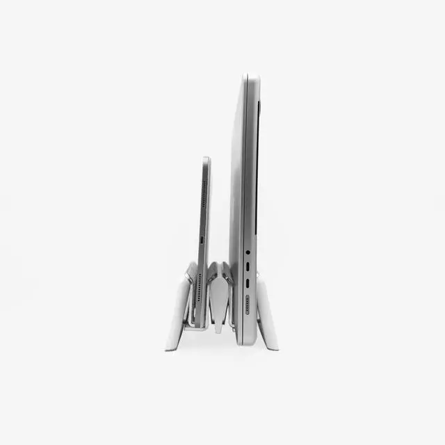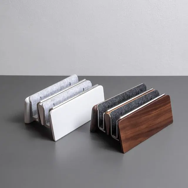 Designed to optimise your desk space our vertical laptop stand is crafted with premium hardwood and stainless steel, it offers a perfect balance of weight for effortless one-handed operation while merino wool felt lining cradles and safeguards your laptop.