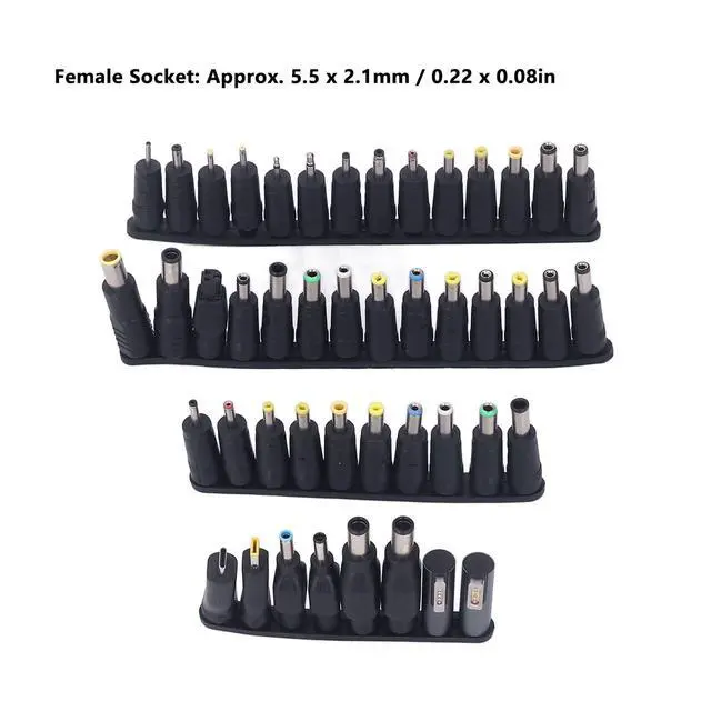 [Universal Adapter] This conversion plug for external power and on board is a universal laptop connector. ^^ [Storage Box] This multi functional DC plug comes with a storage case for easy storage and portability, so you don't have to worry about losing the plug. ^^ [Applicable ] This multifunctional DC plug is suitable for for for, for, for Fujitsu, for monitor plugs, etc. ^^ [Complete Accessories] This adapter kit contains not only adapters, but also power cables, clips, banana tips, etc. ^^ [58PCS Set] This multifunctional DC plug for AC power adapters, all female chassis are 5.5 x 2.1 mm, in sufficient quantity.