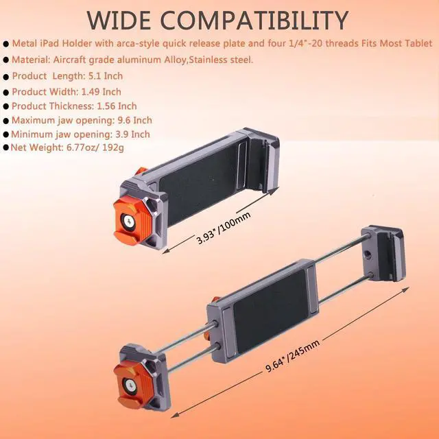 Features: Metal Tablet Holder with arca-style quick release plate and three 1/4"-20 threads Fits Most Tablet Like (for... Compatible for iPad 2021 2020 2019 2018 2017 9.7" / 10.2" mini 5 4 3 2 1 Pro 9.7 inch/ 10.5 inch air 3 2 1 7 6 5 4 3 2 Compatible for Samsung Galaxy Tab S6 S5E S4 S3 S2 S E A 4 3 2 Pro (7", 8", 8.4", 9.6", 9.7" 10.1" 10.5" ) Compatible for Asus Zenpad 3S Z10 S C 10 Z8s Z8, Memo Pad 8/FHD 10, VivoTab 8, 7" 7.9" 8" 9.7" 10.1" Tablet Compatible for Lenovo Tab 4 Plus / 4 / 3 / 2, IdealTab S5000 / A1000 / A1000L / A10-70 / A8-50 / A2109 / Mixx2 / Mixx / K3 / S2110 / S2109 / A2107 Compatible LG G Pad V400 V700 LK460 V930 V498 V530 V480 UK750 V940N V520 V521 AK495 UK495 Compatible for Google Nexus 10 9 7 Nokia N1 Pad 7.9" Sony Xperia Z4 Z3 Z2 Z Tablet Compatible for Dragon Touch, Acer Iconia, Yuntab, NeuTab, iRULU, Astro Tab, Toshiba Excite Tablet & other 7-11 inch Android TabletYou Can Install It on Ball Head of Tripod Quickly.