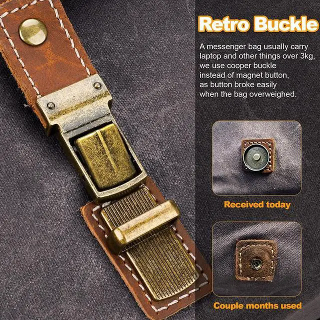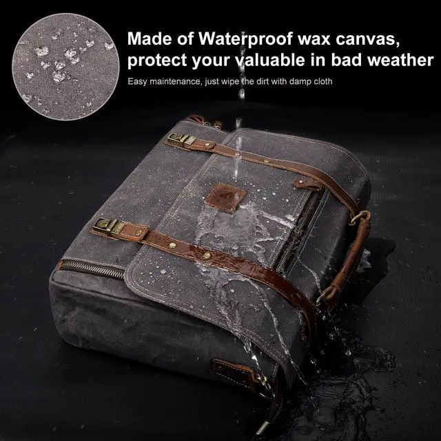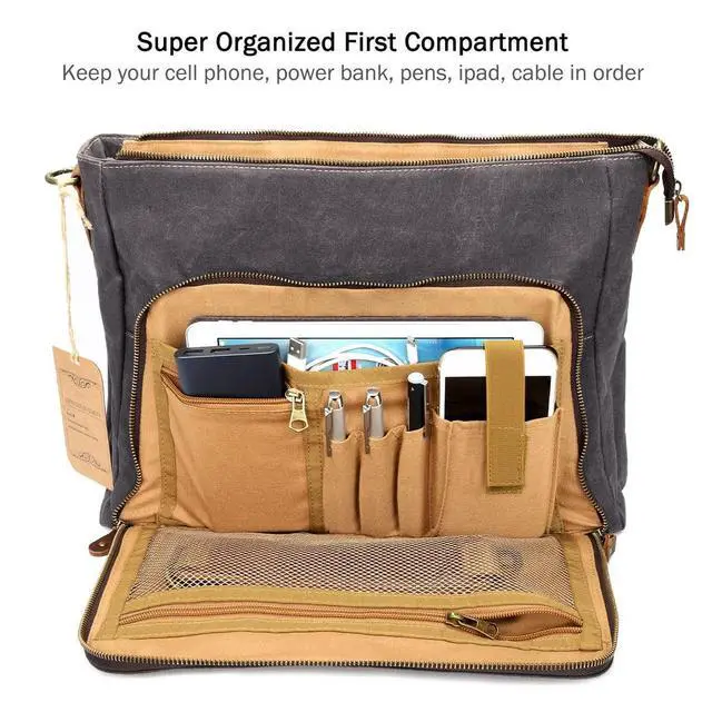 --RESILIENT & WATER-PROOF --The canvas messenger bag is crafted from 80% water proof Solid Canvas + 20% superior cowhide crazy horse leather. Long-lasting, water repellent and shock-resistant. Disordered wrinkles and scratches on surface create a vintage and wild looking. ^^ --LOTS OF STORAGE SPACE&POCKETS --Men messenger bag is designed with one separate laptop compartment hold 15.6 Inch Laptop as well as 15 Inch, 14 Inch and 13 Inch Macbook/Laptop, one big compartment for document. The unique front compartment with 7 pockets, pen pockets, cellphone pocket, power bank pocket and mesh pocket, make your items organized and easier to find.