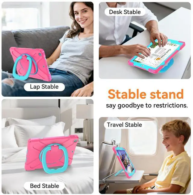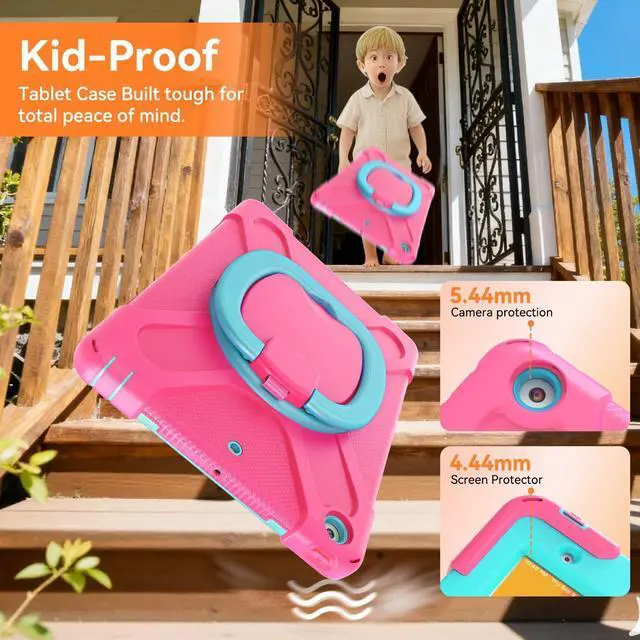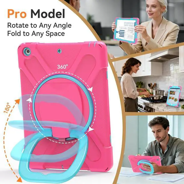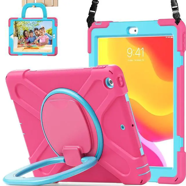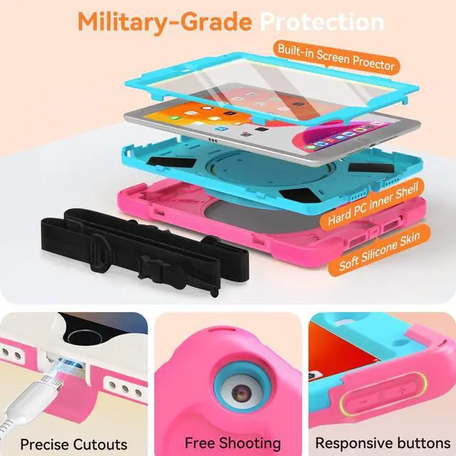 Precision-Fit Compatibility This protective tablet cover offers a professional-grade fit compatible with Apple iPad 9th Generation 10.2 Inch 2021, Apple iPad 10.2" 8th Generation and the Apple iPad 10.2" 7th Generation to provide edge-to-edge protection, accessibility, and convenience. ^^ Advanced Shock and Drop Protection Each 10.2 -inch tablet case is made with high-grade thermoplastic polycarbonate and shockproof silicone. This makes our 3-tier iPad 10.2 case waterproof, dustproof, and more durable for kids and adults. ^^ Hands-Free Viewing Stand Ideal for travel, home, school, and work use our tablet protector features a 360 rotating handle that also folds 180 to give you multiple viewing angles.