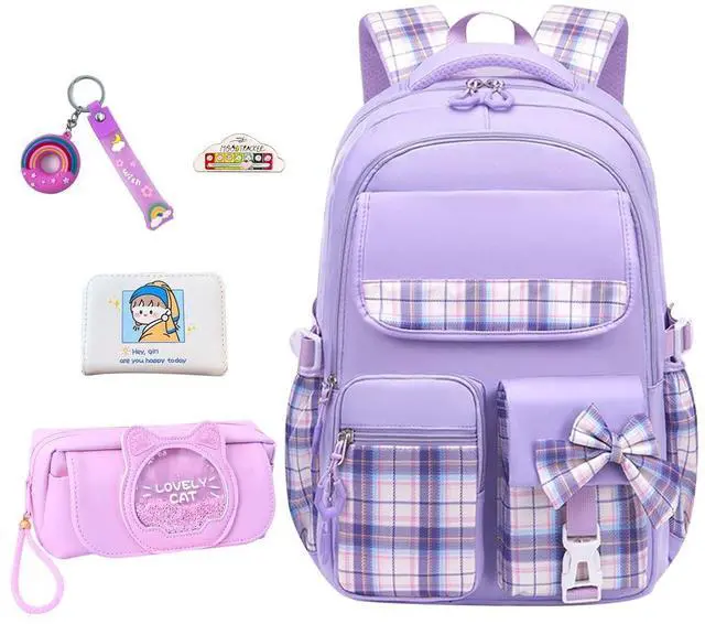 Set: Stylish Plaid Bow Backpack / Girls Wallet / Pencil Bag / Keychain / Mood Pin. This 5-pack set includes a stylish plaid bow girls' backpack, wallet, pencil bag, keychain, and mood pin. The backpack measures 11.3" x 7.1" x 16.5" (LWH) and features a padded compartment sleeve that fits 14", 15", and 16" tablets or laptops.
