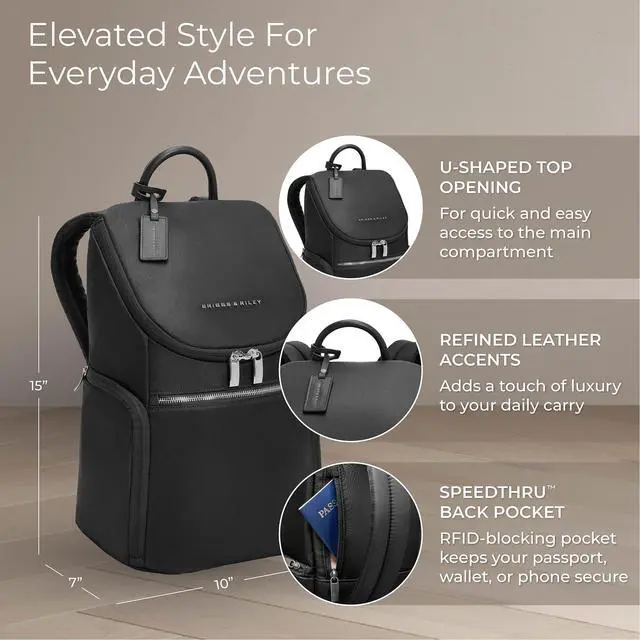 EVERYDAY BACKPACK - Whether for work or travel, this functional U-Zip backpack features a unique top U-shaped opening for easy access, RFID protection, and padded straps for comfort ^^ PREMIUM CRAFTSMANSHIP - Crafted from durable yet lightweight micro-weave nylon and full-grain leather, this backpack is built for lasting use. Personalization options make it uniquely yours ^^ GENEROUS STORAGE - This U-Zip backpack features a well-organized design with a spacious main compartment, a padded sleeve for your laptop, and multiple pockets to store smaller items ^^ THOUGHTFUL DETAILS - The backpack features a hidden back security pocket, a SpeedThru pocket for easy access to essentials, and a slip-through back panel to place over wheeled luggage ^^ TRAVEL WITH CONFIDENCE - Crafted for long-term use, Briggs & Riley bags are designed with high-grade materials and come with lifetime repair service for damage from normal use